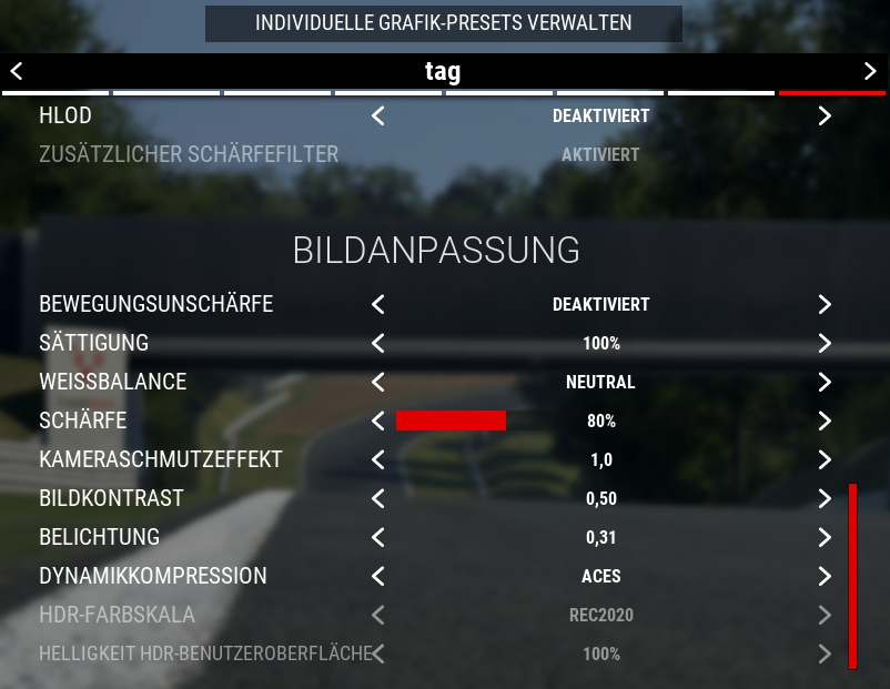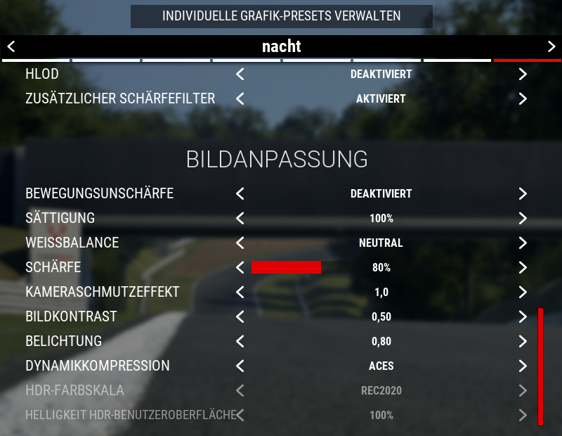 Ob Tag oder Nacht ist für die Sichtverhältnisse auf der Strecke entscheidend, diesem kann mit den richtigen Einstellungen besser Dargestellt werden. Einfach die Belichtung verändern und schon gibt es in der Nacht eine Bessere Sicht. Die verschiedenen Preset´s Abspeichern und der Wechsel dauert nur 4 Kick´s.